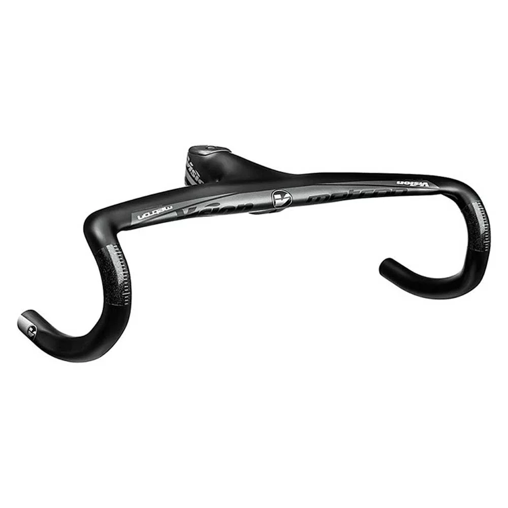 Metron 5D integrated handlebar, the stiffest and most aero integrated handlebar and stem system. Mixing aerodynamics and ergonomics, the unique shape includes our Aero-Ergo central section. With a slight rise from the stem clamp and a 10 degree forward bend, the 5D accommodates the natural position of your arms for more comfort and easier breathing, while the wing-like shape of the bar top aids aerodynamics. Reinforced carbon fiber construction gives a great strength-to-weight ratio. The 5D features internal cable routing, with guides that accommodate wiring for electronic shifting.